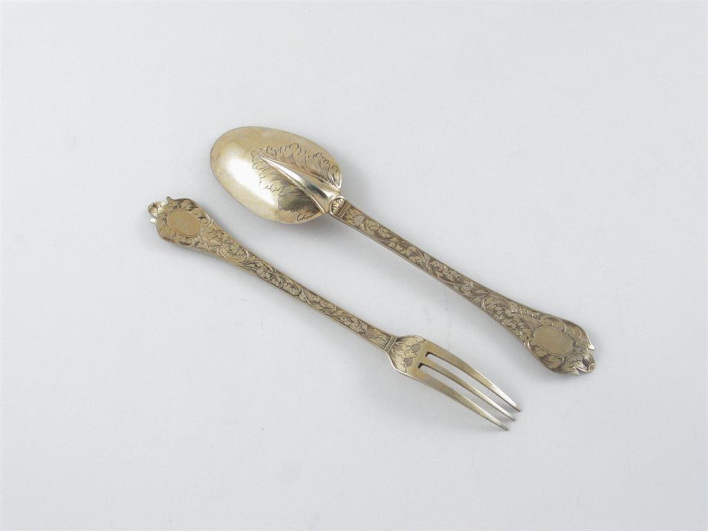 A William III engraved silvergilt trefid spoon and fork, with vacant oval cartouches on the front and back of the stems, the spoon with a ridged rattail flanked by foliage, unmarked 1695-1700, the spoon 8in (20.3cm) long, 2.25oz. (2)