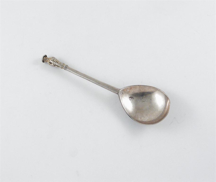 A rare Elizabeth I ascribed North Country apostle, St Paul: the figure with traces of gilding and sword, the back of the bowl scratched with the initials "TT", by Thomas Pinder, York 1593, 6.75in (17cm) long, 1.5oz.