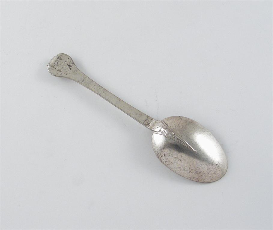 A Charles II unascribed provincial trefid spoon, with a scroll-decorated rattail, the back of the terminal scratched "MW" over "Ex dono" over "AA", maker's mark only, "EB" in a heart-shaped punch [struck once], unascribed 1670-1680, 7.4in (18.7cm), 1.6oz.