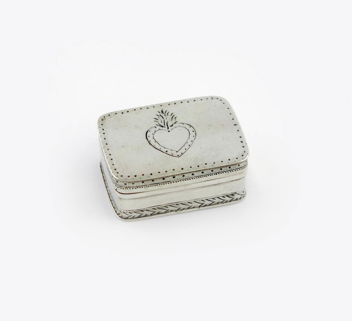 rectangular form, the hinged cover engraved with a heart, engraved borders, the interior with a silver-gilt grille pierced with a building and foliate decoration, length 3.5cm, approx. weight 0.6oz.