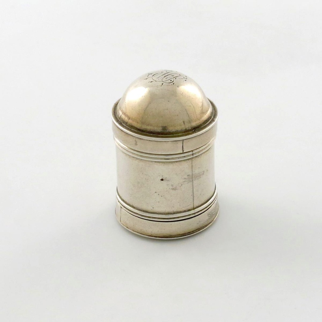 cylindrical form, pull-off domed cover, initialled, pull-off base, height 3,2cm, approx. weight 0.4oz.