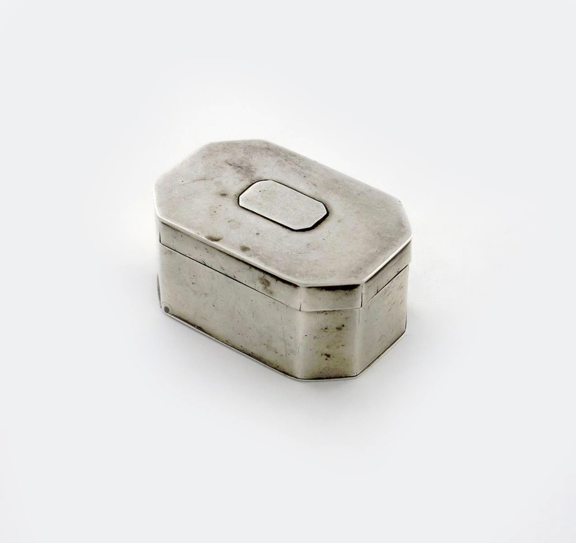rectangular form, canted corners, the hinged cover with a later applied cartouche, hinged base, length 4.8cm, approx. weight 1.6oz.