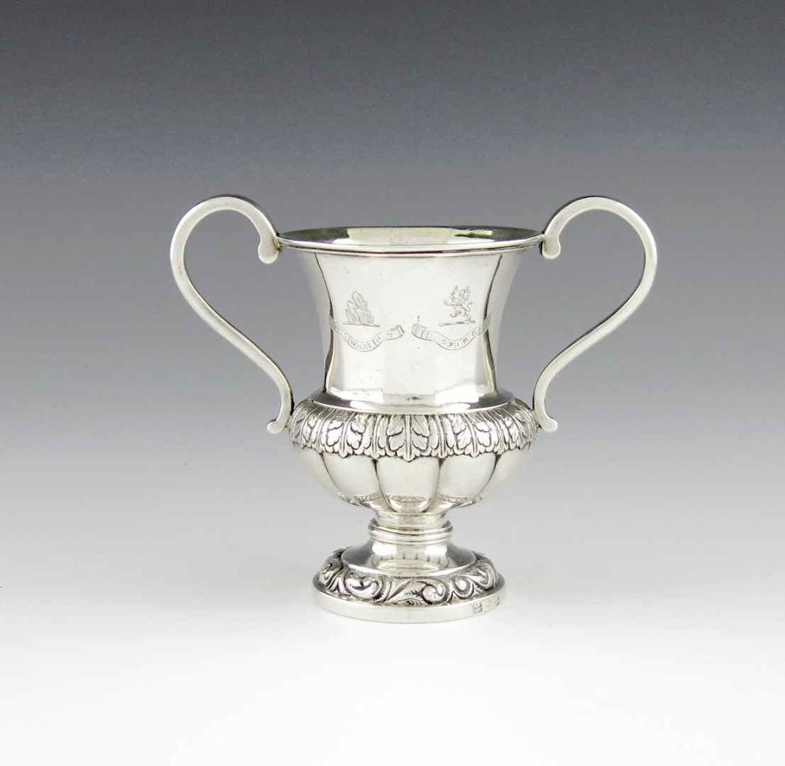 campana form, foliate girdle, scroll handles, engraved with two crests and mottos, on a raised circular foot, height 12cm, approx. weight 7.8oz.