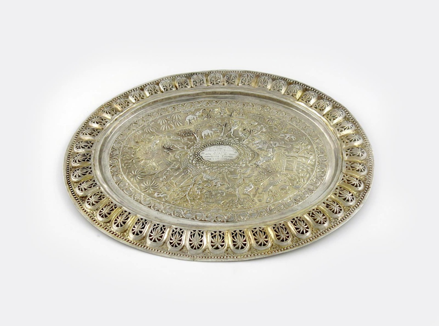 oval form, 'Vignette pattern', pierced border, the centre inscribed 'Presented to Mr and Mrs R.B. Young by the Y.M.C.A. Naina-Tal October 1920', length 40cm, approx. weight 16.7oz.