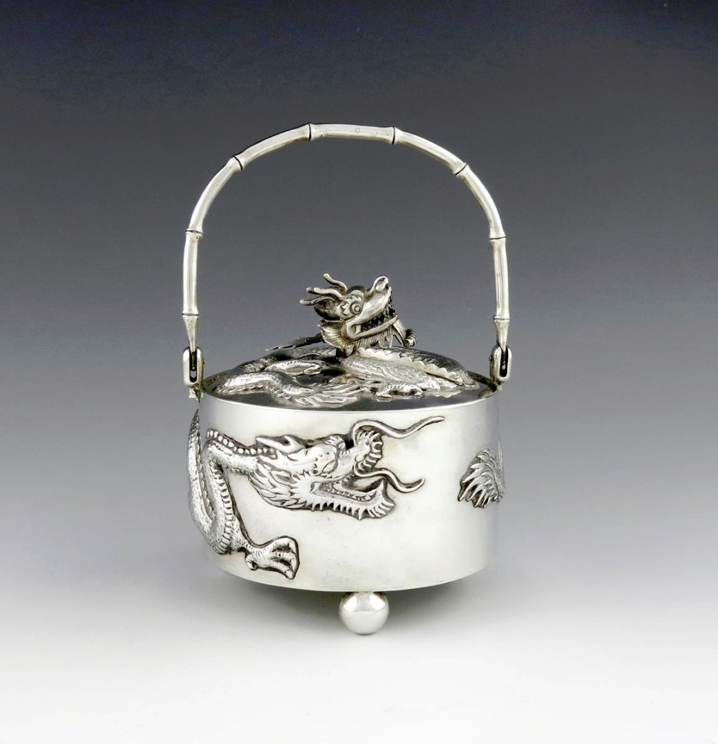 circular form, the body applied with a dragon, simulated bamboo swing-handle, the pull-off cover with a dragon head finial, diameter 10cm, approx. weight 15oz.