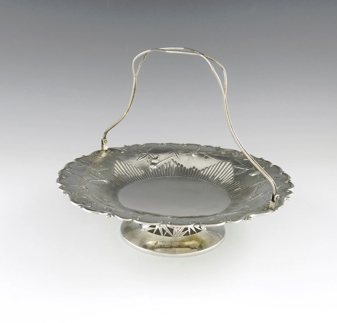 circular form, with birds and bamboo decoration, on a matted background, pierced swing-handle, on a raised pierced circular foot, diameter 26.2cm, approx. weight 17.5oz.