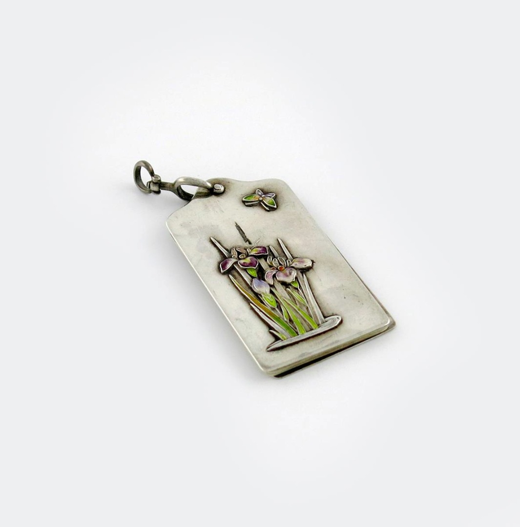 rectangular form, enamelled with butterflies, lilies and flowers, with a ring attachment, the interior with two ivory sheets, length 5.5cm.