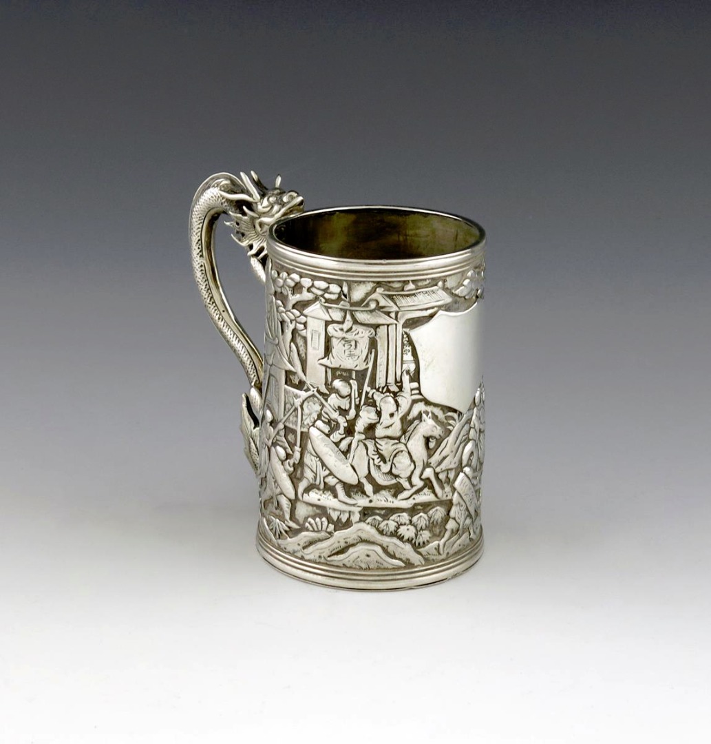 tapering circular form, with figural scenes within landscape settings, dragon scroll handle, the front with a vacant shield cartouche, height 10cm, approx. weight 5.5oz.