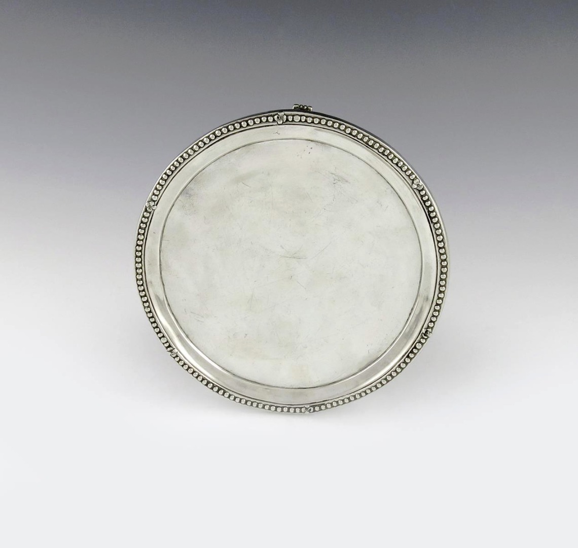 circular form, beaded border, bifurcated scroll bracket feet, diameter 17.3cm, approx. weight 7.1oz.