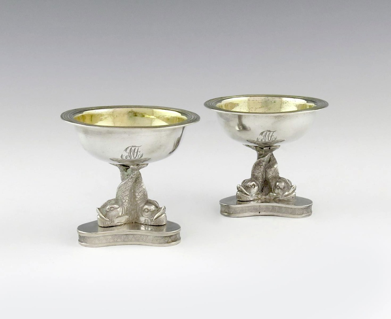 circular gilded bowls with reeded borders, supported by three mythical dolphin supports, on a triangular base, height 7.4cm, approx. weight 9.7oz.