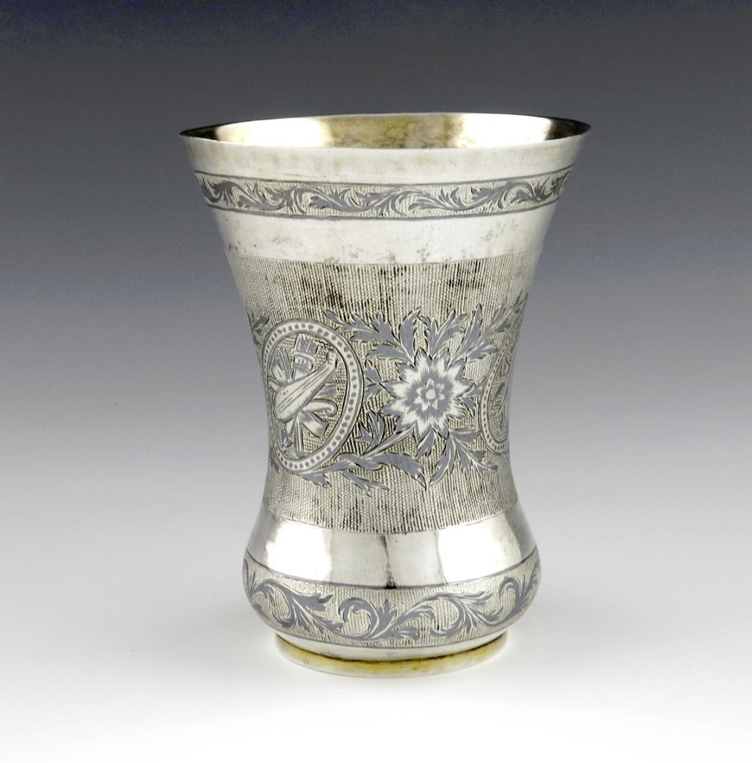 tapering circular form, niello decoration with musical instruments and foliate decoration, on a circular foot, height 11.5cm, approx. weight 5.5oz.