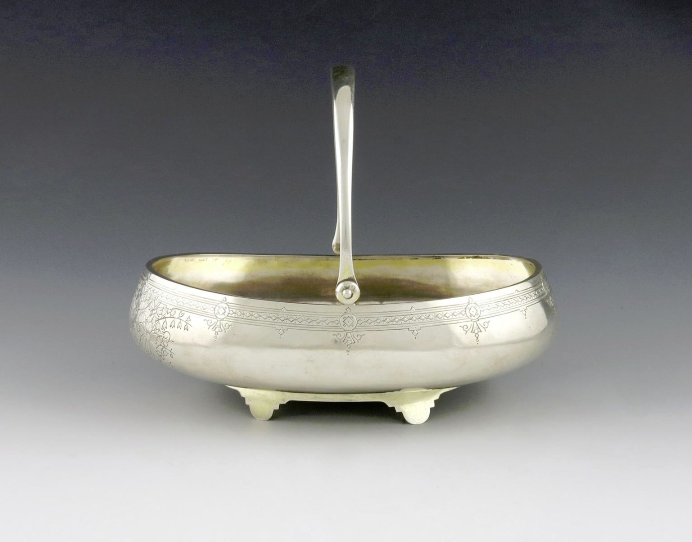 oval form, engraved foliate decoration and stylised borders, plain swing-handle, on four bracket feet, engraved with crowned initials for Olga Chigiani who married Hugh Adair, length 22cm, approx. weight 15oz.