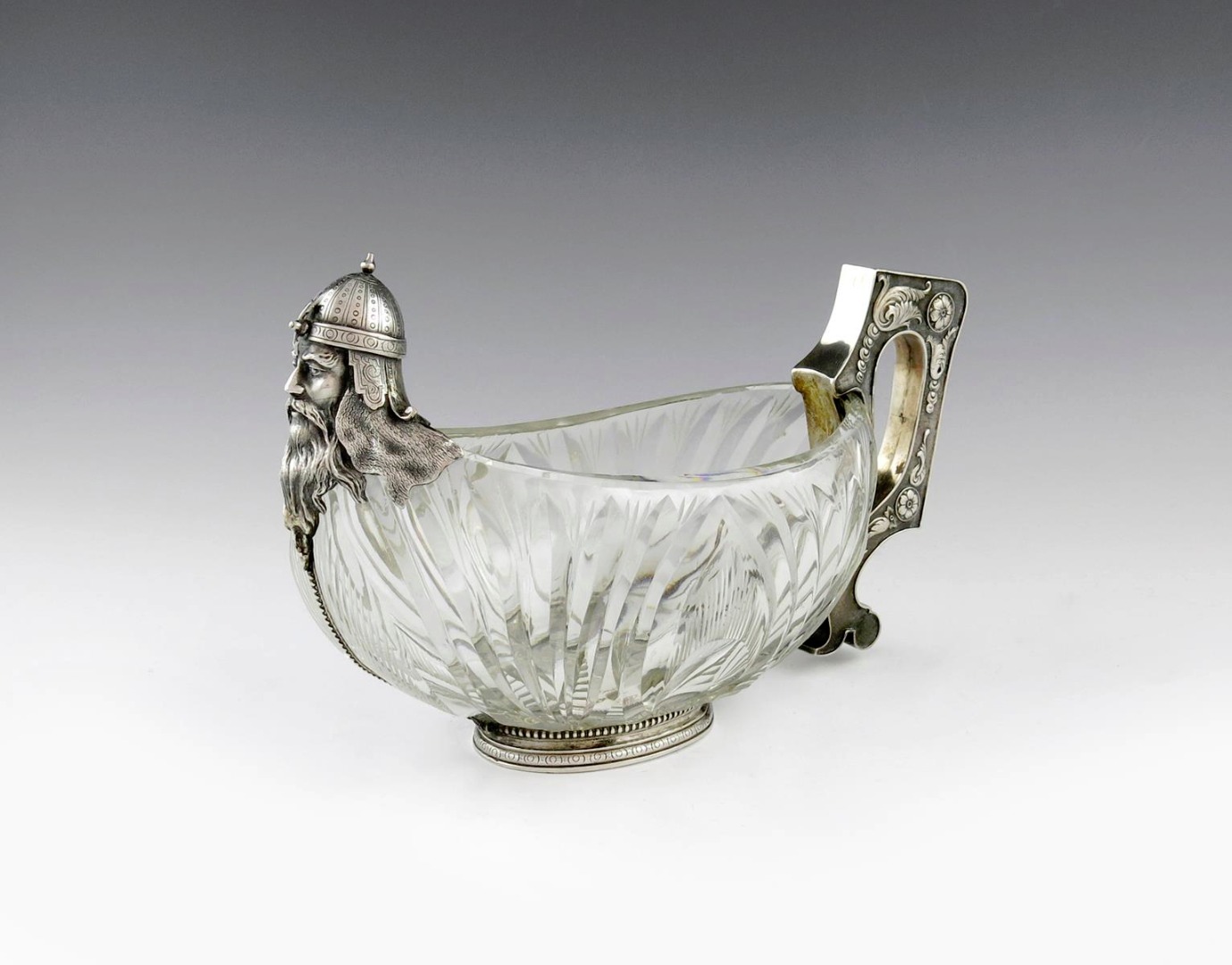 oblong form, cut decoration, the front mounted with the head of a warrior in traditional dress, scroll handle with classical decoration, on an oval foot, height 14cm, length 24.5cm.