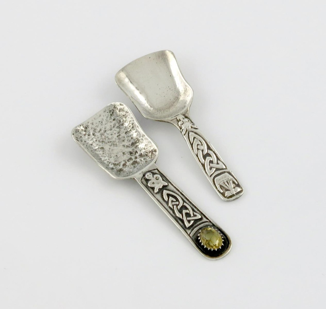 shovel bowls, both with Celtic motifs and one with a yellow glass terminal, the other with a long boat, length 9cm and 8.3cm, approx. weight 1oz. (2)