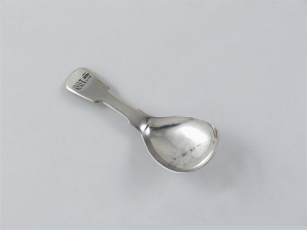 A Victorian fiddle caddy spoon, with a drop-shaped bowl initialled "WS", by George Unite, Birmingham 1842.