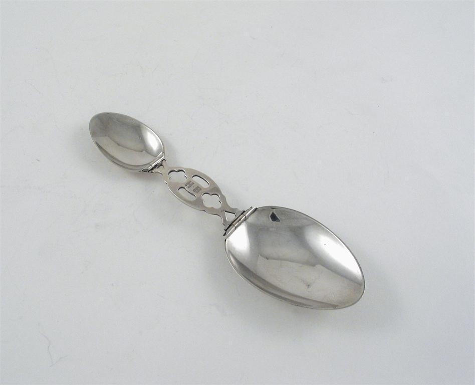 An early 20th century American folding spoon, with a pierced centre section, initialled "H.B", one large bowl and a smaller bowl at the other end, by Gorham & Co, 6.6in (17cm) long (extended), 1oz.