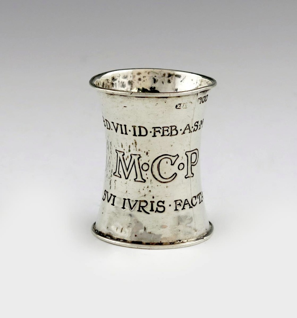 tall waisted circular form, embossed with flower heads and engraved 'A.D. VII. ID. FEB. A.S. MCMX' above 'SVI IVRIS. FACTAE', and embossed 'M.C.P', height 5.6cm, approx. weight 0.9oz.