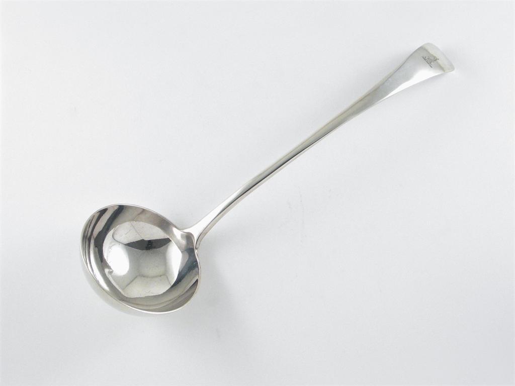 An Edwardian soup ladle, crested, by Jackson & Fullerton, London 1903, 12.75in (32.4cm) long, 9.5oz.