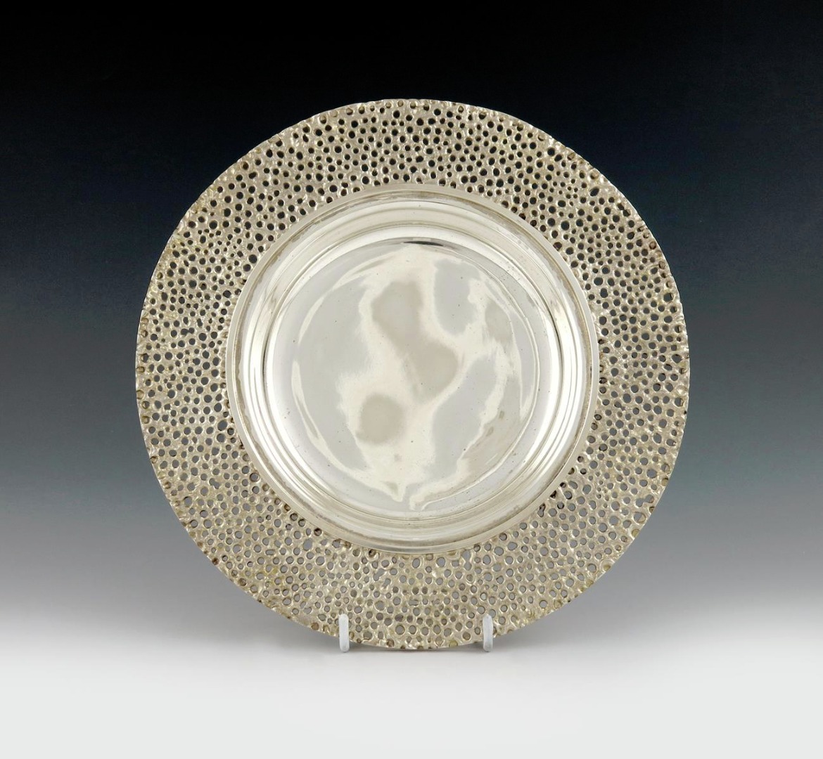 circular form, pierced and textured border, on a circular foot, diameter 22.5cm, approx. weight 15oz.