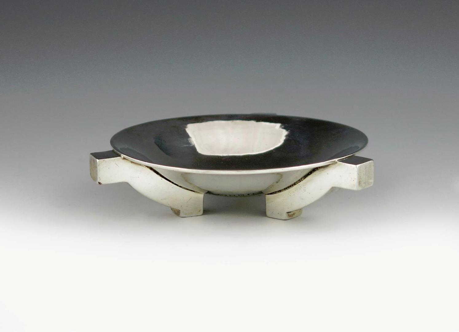 shallow circular form, with three geometric legs, diameter 11.5cm, approx. weight 6.3oz.