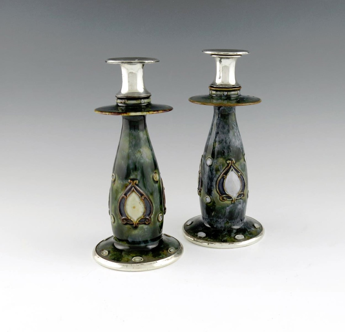 A pair of Edwardian silver-mounted Doulton candlesticks
