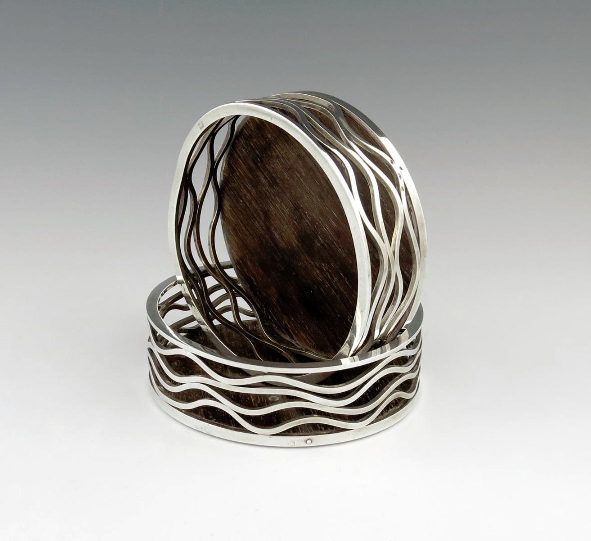 circular form, pierced wire-work wavy decoration, rosewood bases, height 4.8cm, diameter 15.2cm. (2)