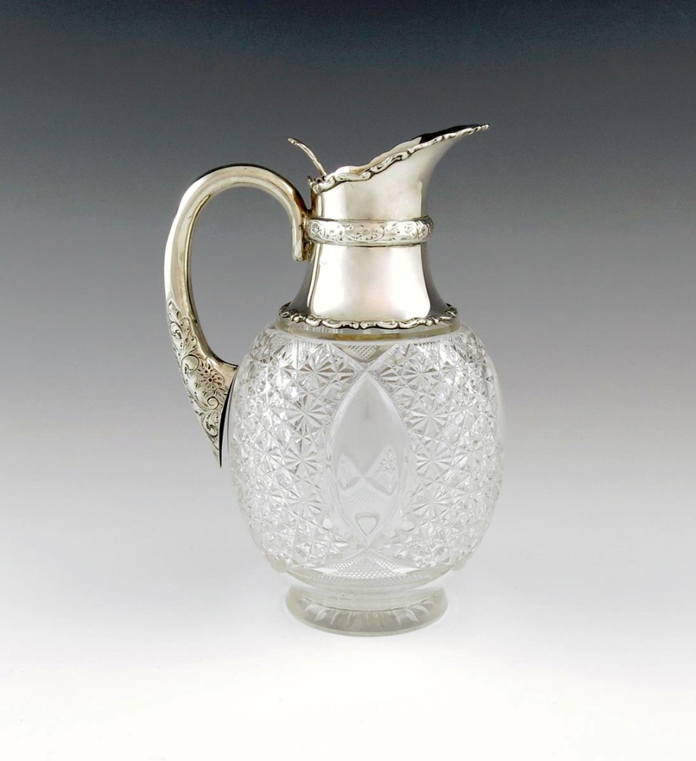 tapering circular form, with hob-nail cut decoration, tapering mount with scroll border, sloping cover and spout, engraved handle, height 22cm.