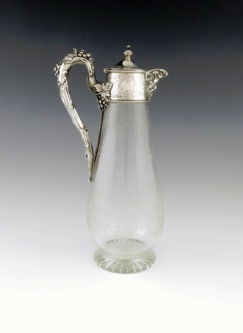 tapering circular body, with etched decoration, on a circular foot, with a scrolling grape and vine handle, engraved mount and Bacchus spout, height 31.2cm.