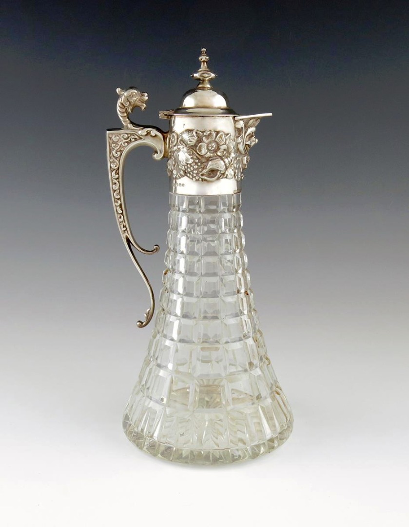 tapering circular form, with hob-nail cut body, the mount with floral, shell and grape decoration, angular handle with a dragon head thumb-piece, height 30.5cm.