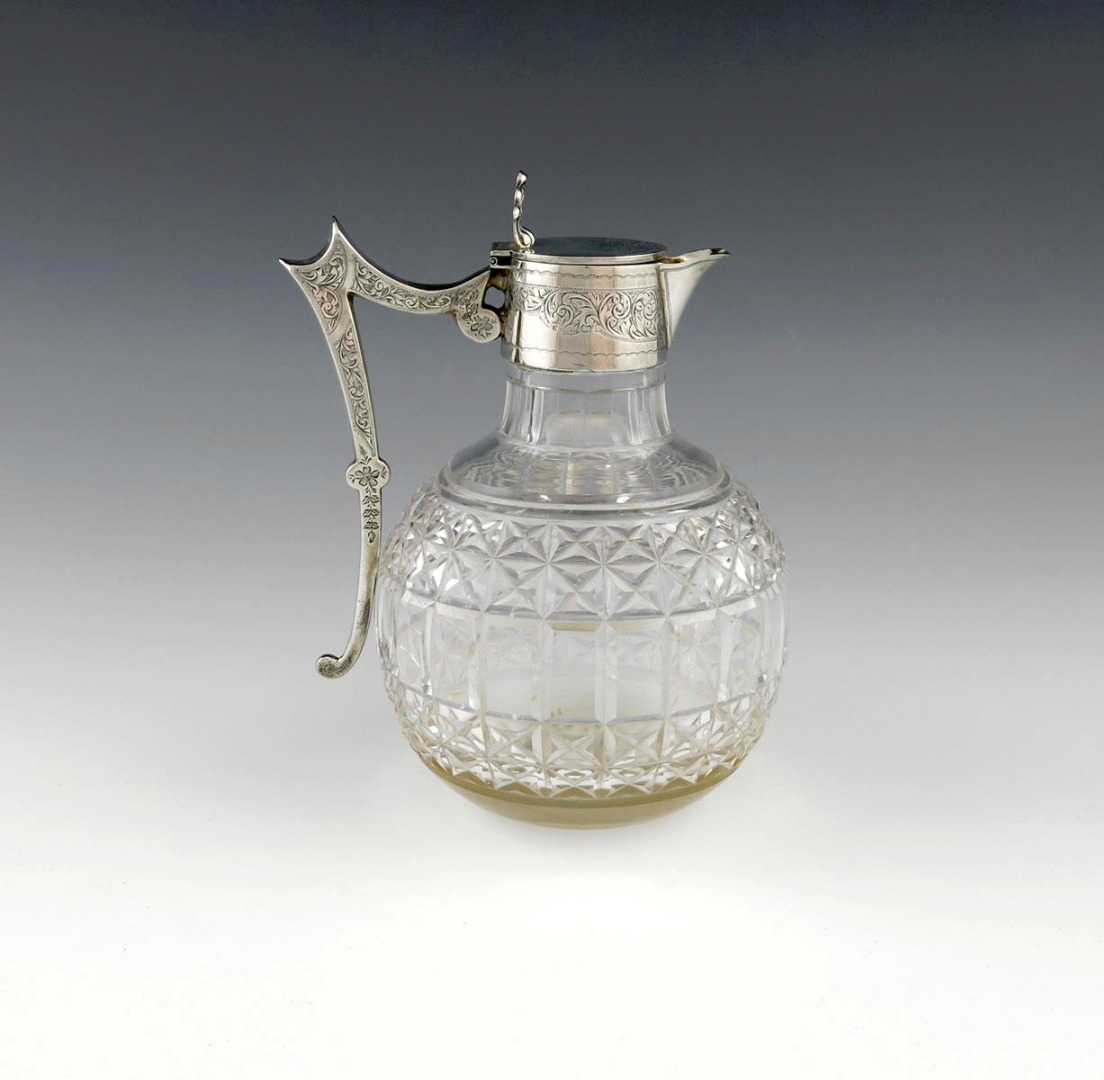 circular body with hob-nail cut body, engraved mounts with engraved angular handle, height 19.2cm.