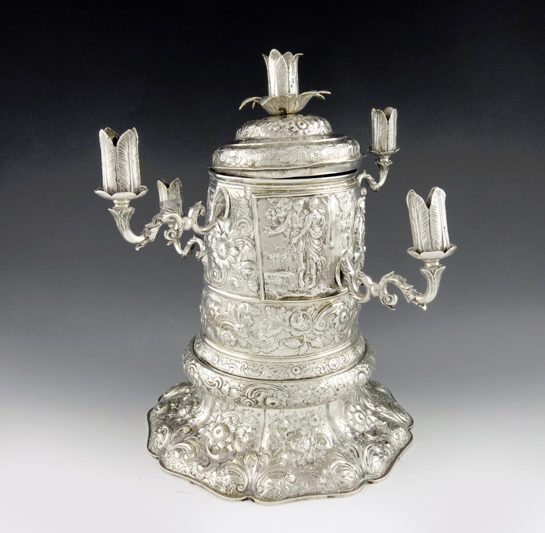 the tapering circular body applied with a figural relief panel, and embossed with foliate scroll decoration, pull-off cover with a loose finial, the detachable scroll branches with leaf capitals, on a detachable spread circular foot, height 35cm, approx. weight 96oz.