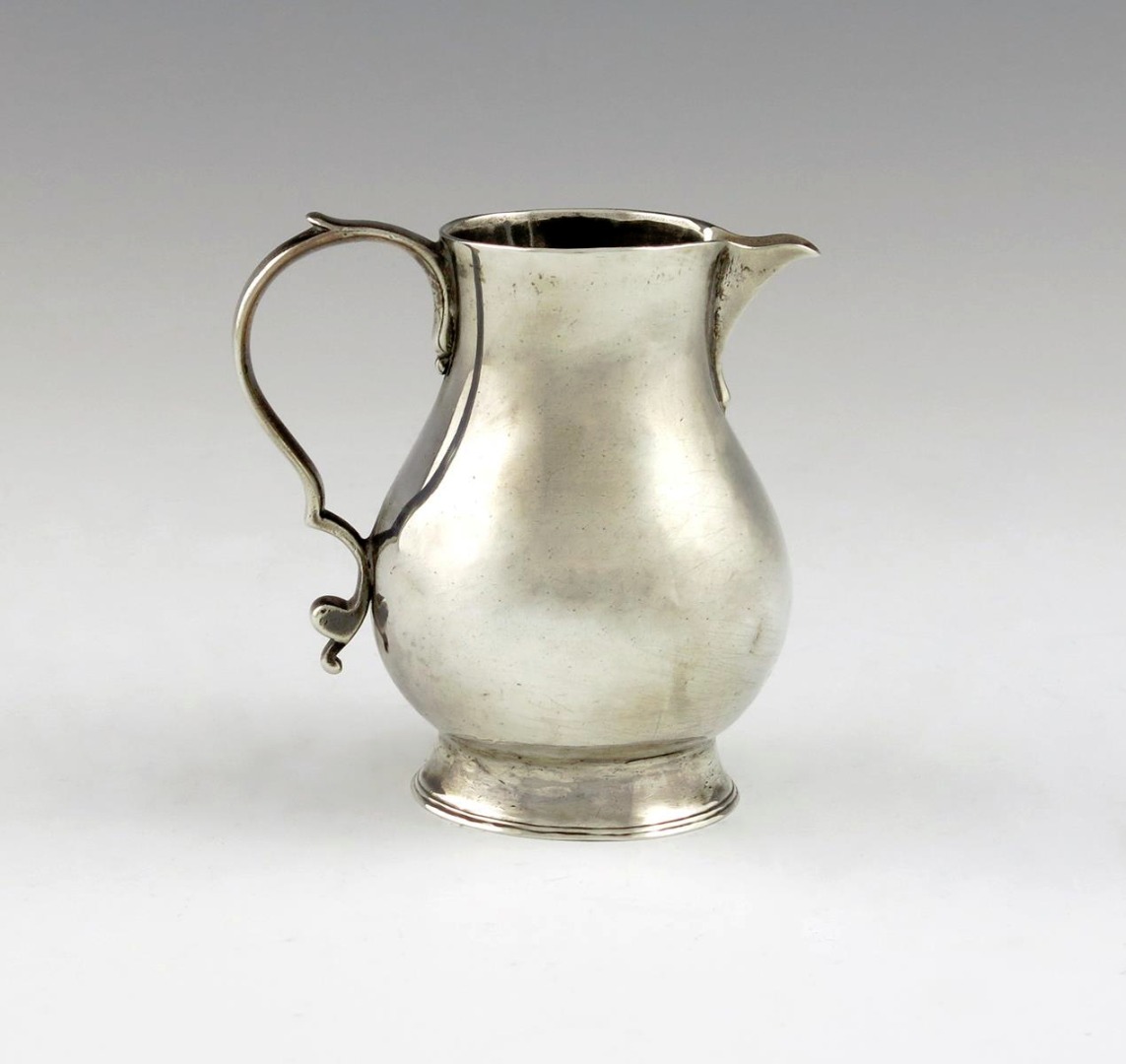baluster form, with a scrolling handle, on a raised circular foot, height 7.8cm, approx. weight 3oz.