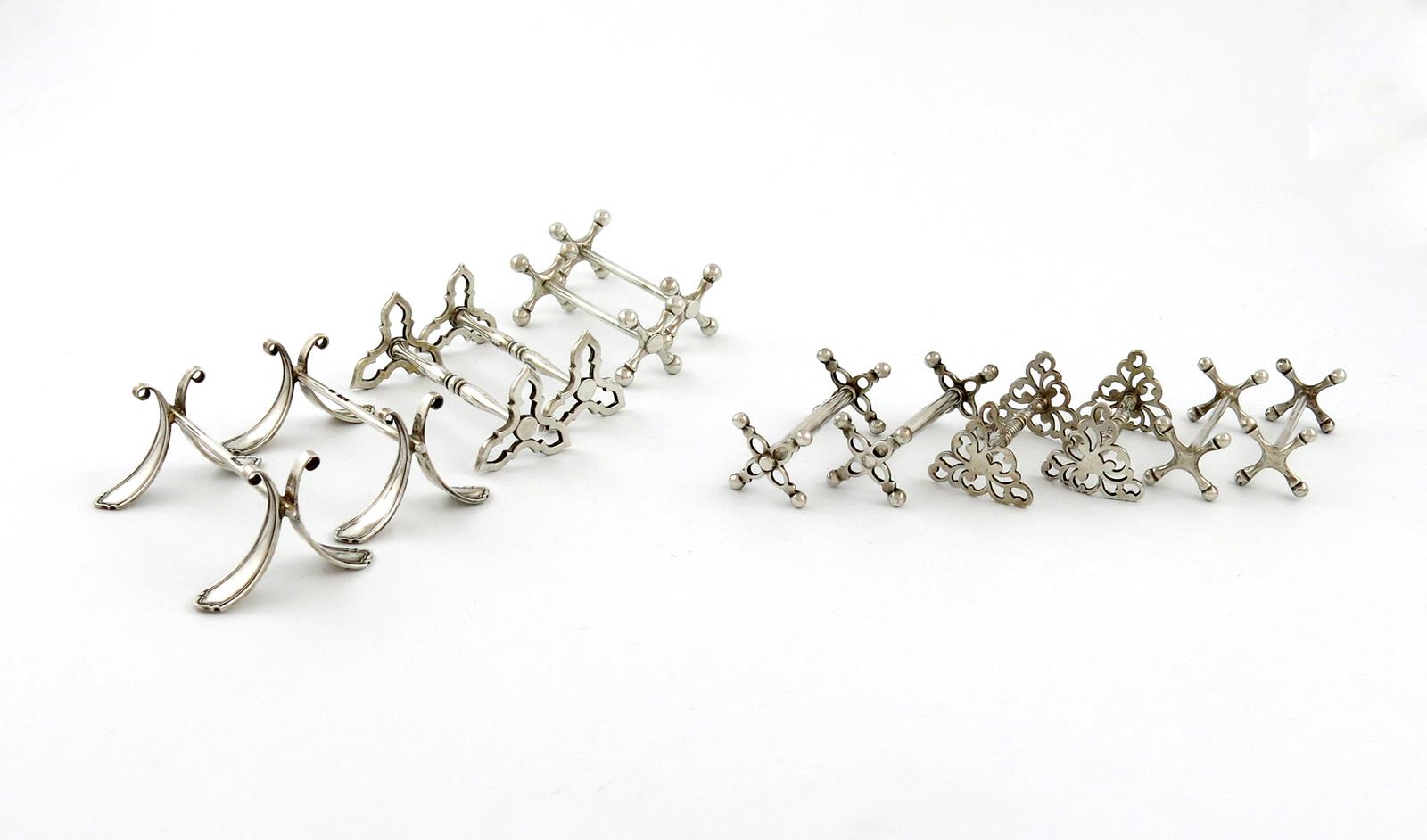 comprising: a pair by Atkin Brothers, Sheffield 1907, plain stem with ball finials, length 7.5cm, plus a pair by Atkin Brothers, Sheffield 1928, plain stem with Windsor pattern supports, length 8.3cm, a pair Chester 1912, length 8.5cm, a Victorian pair, London 1878, length 6.4cm, a pair Sheffield 1899, length 7.2cm, and a pair Chester 1890, length 8cm, approx. weight 13oz. (12)