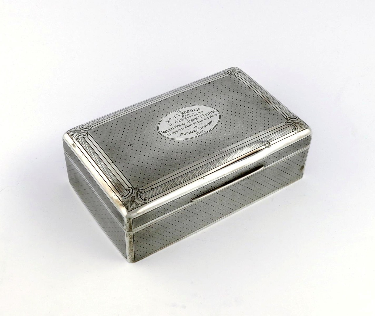 engine-turned decoration in the French manner, the solid hinged cover with a presentation inscription, plain thumb-piece, the interior base wood lined, length 22.8cm.