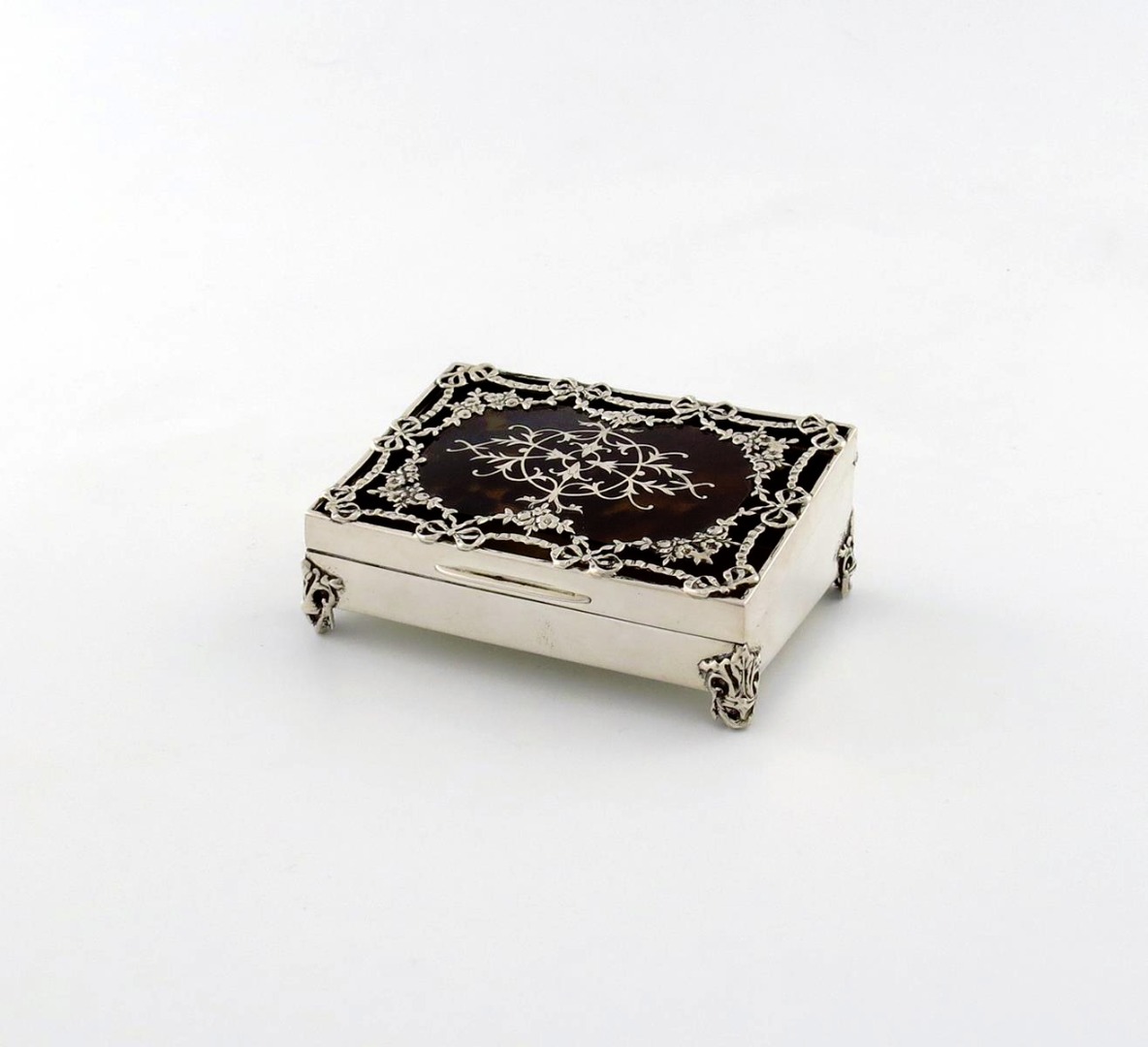 rectangular form, the hinged cover inlaid with decoration and applied with ribbon-tied borders, on four pierced bracket feet, length 10.5cm.