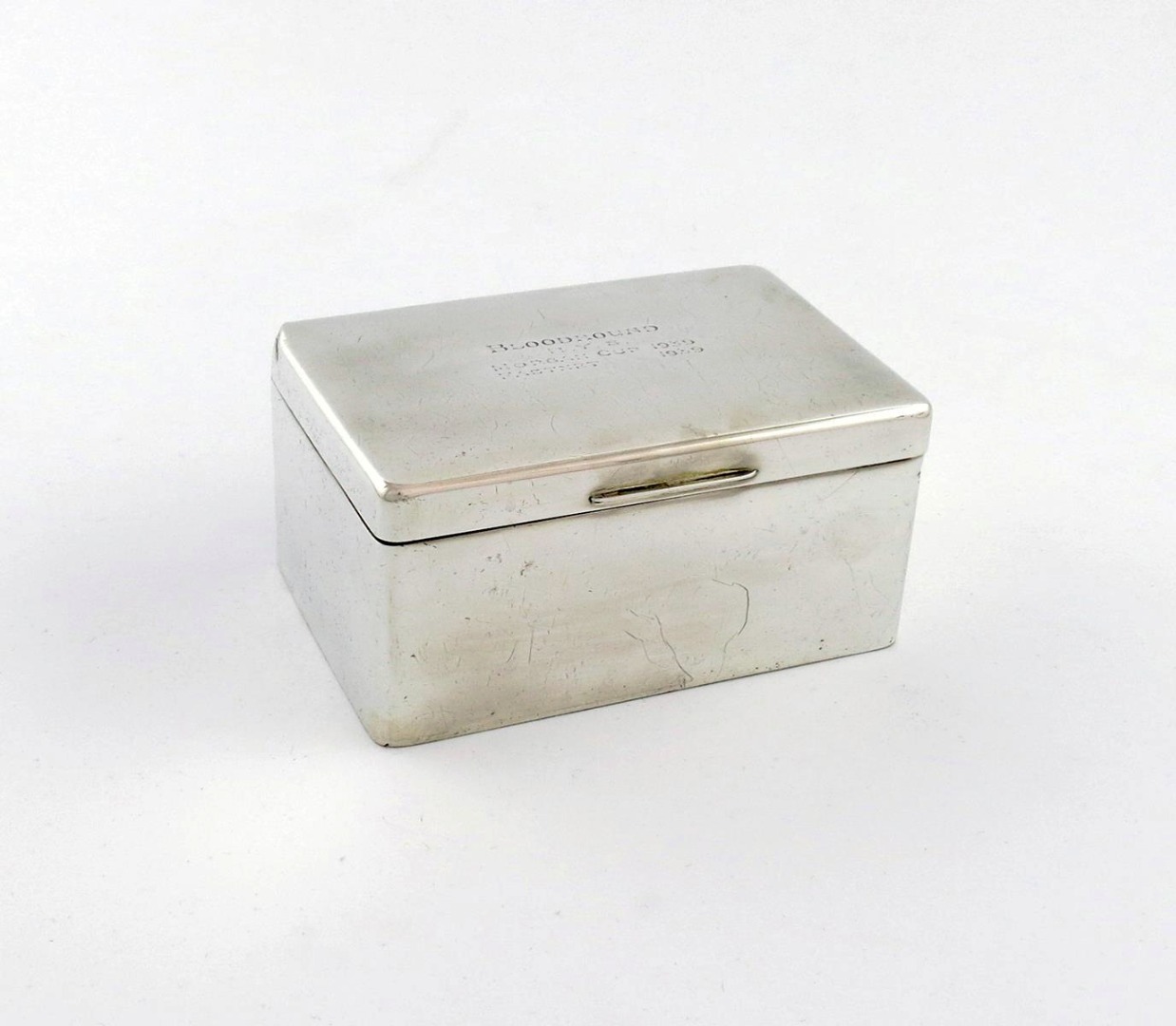 rectangular form, the hinged cover inscribed 'BLOODHOUND' 'R.Y.S' 'MORGAN CUP 1939', and 'FASTNET 1939', length 13.3cm.
