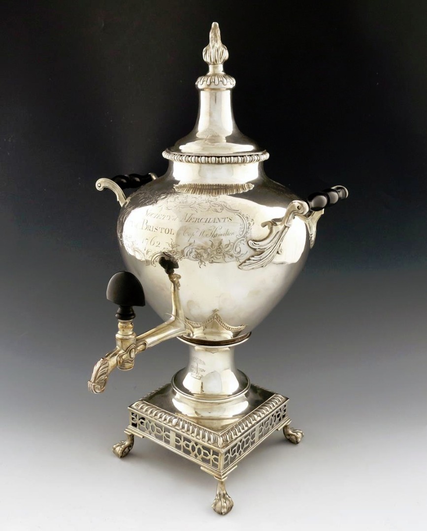 inverted pear form, side silver and turned baluster wooden handles, gadroon border, the pull-off cover with a flame finial, on a raised circular stem on a square base with fret-work and on four claw and ball feet, leaf capped spout, inscribed 'The Gift of The Society of Merchants City of Bristol to Capt. Wm. Hamilton 1762', the reverse with two armorials and with a large palm tree being cut by a saw and engraved 'Through', in the original fitted case, height 46cm, approx. weight 71.5oz.