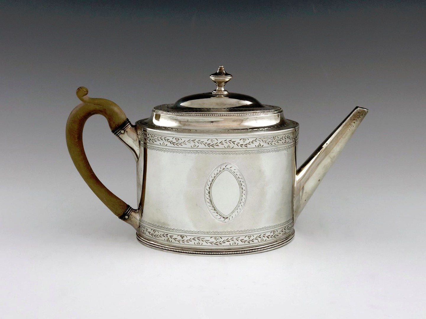 oval form, bright-cut decoration, beaded borders, scroll handle, with two vacant oval cartouches, length handle to spout 24.5cm, approx. weight 11.5oz.