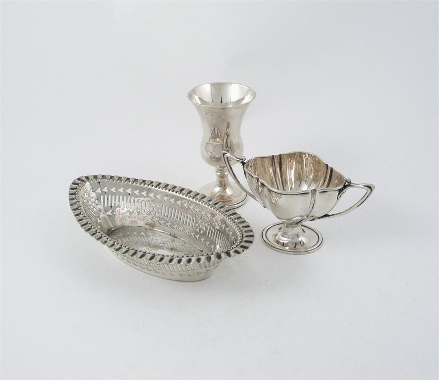 A mixed lot: A bon bon dish, a small two handled sugar bowl and a goblet, (3)