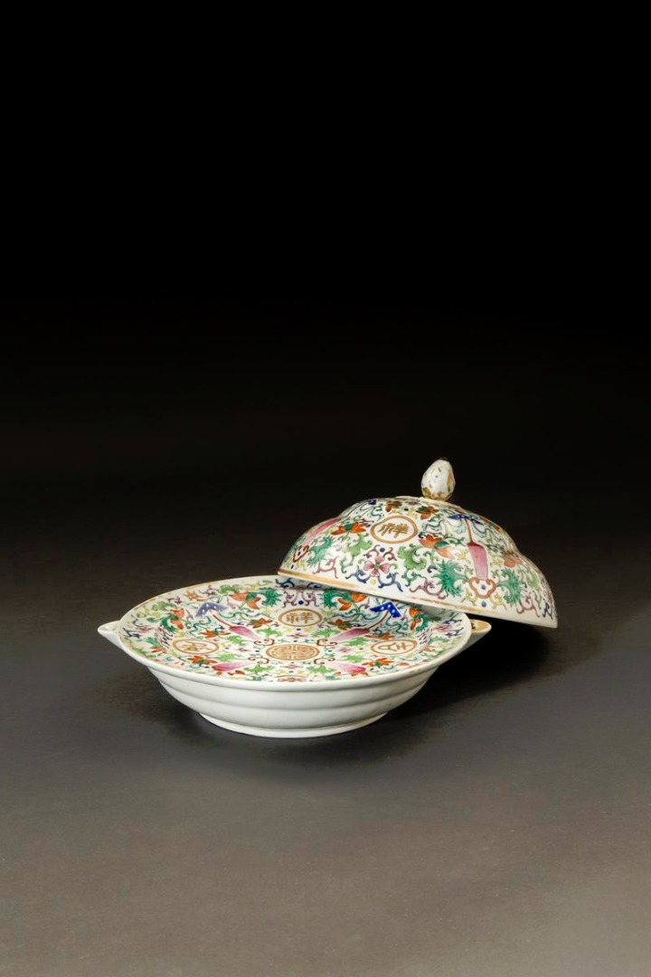 A CHINESE FAMILLE ROSE WARMING DISH AND COVER 19TH CENTURY The domed cover and dish similarly...
