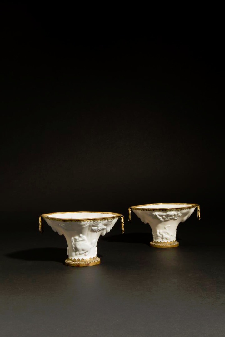 A PAIR OF CHINESE BLANC DE CHINE GILT COPPER-MOUNTED LIBATION CUPS C.1700 Each moulded to the...