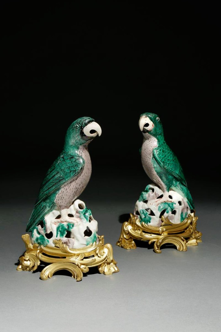 A PAIR OF CHINESE FAMILLE VERTE MODELS OF PARROTS KANGXI 1662-1722 Each modelled on an openwork...