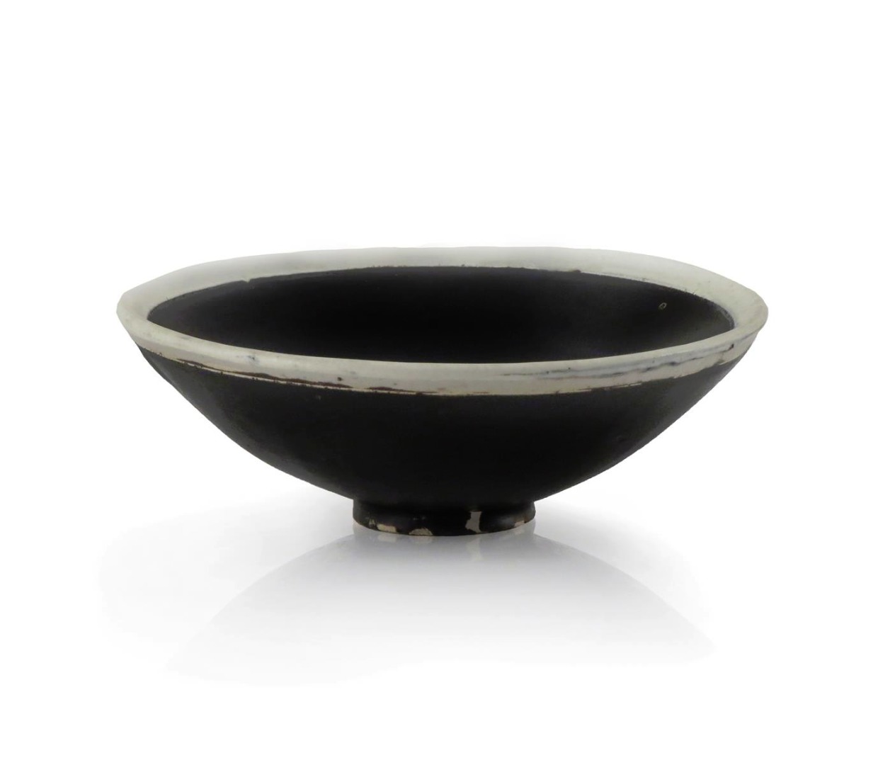 The wide conical body decorated with a dense black glaze, the rim with a thick white band, the foot unglazed, 14.2cm.