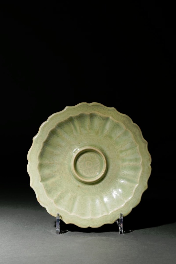A GOOD CHINESE LONGQUAN CELADON GLAZED STAND EARLY MING DYNASTY The shallow body moulded with...