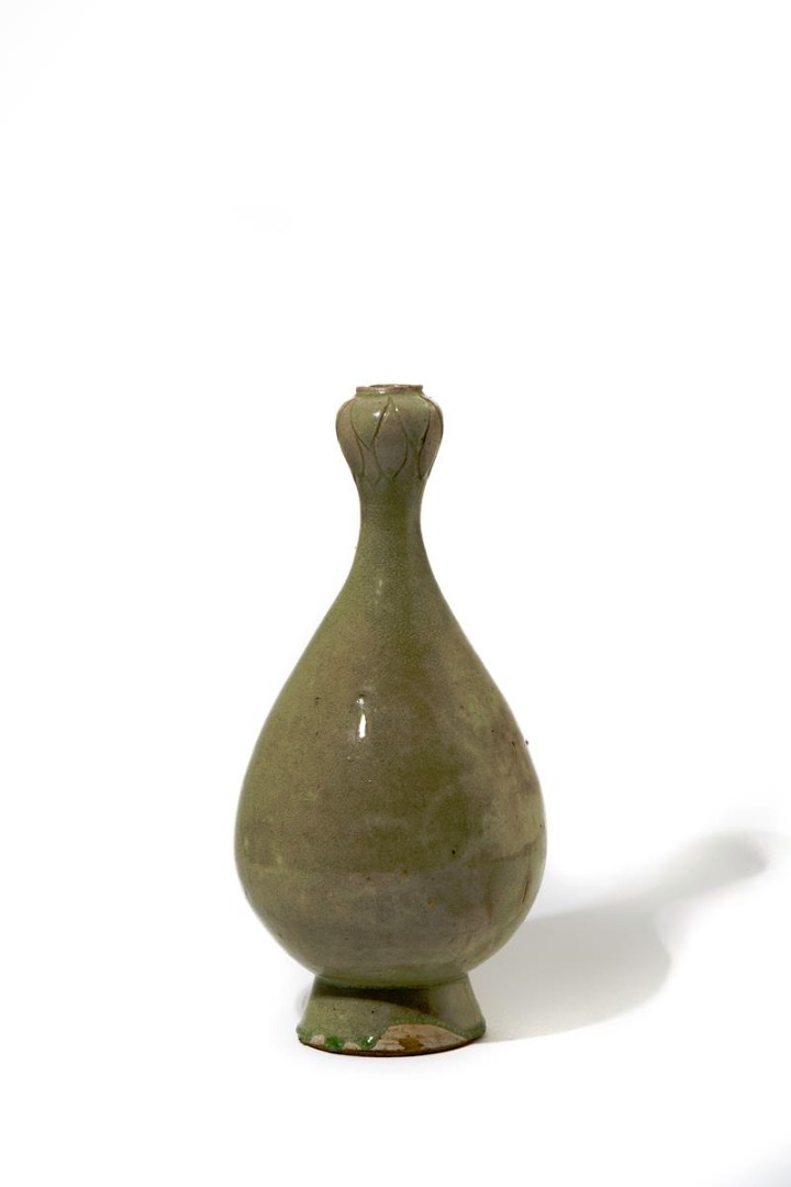 The pear-shaped body raised on a tall flaring foot and with a garlic-mouthed neckrim moulded with petals, decorated with a slightly crackled celadon glaze, 46cm.
