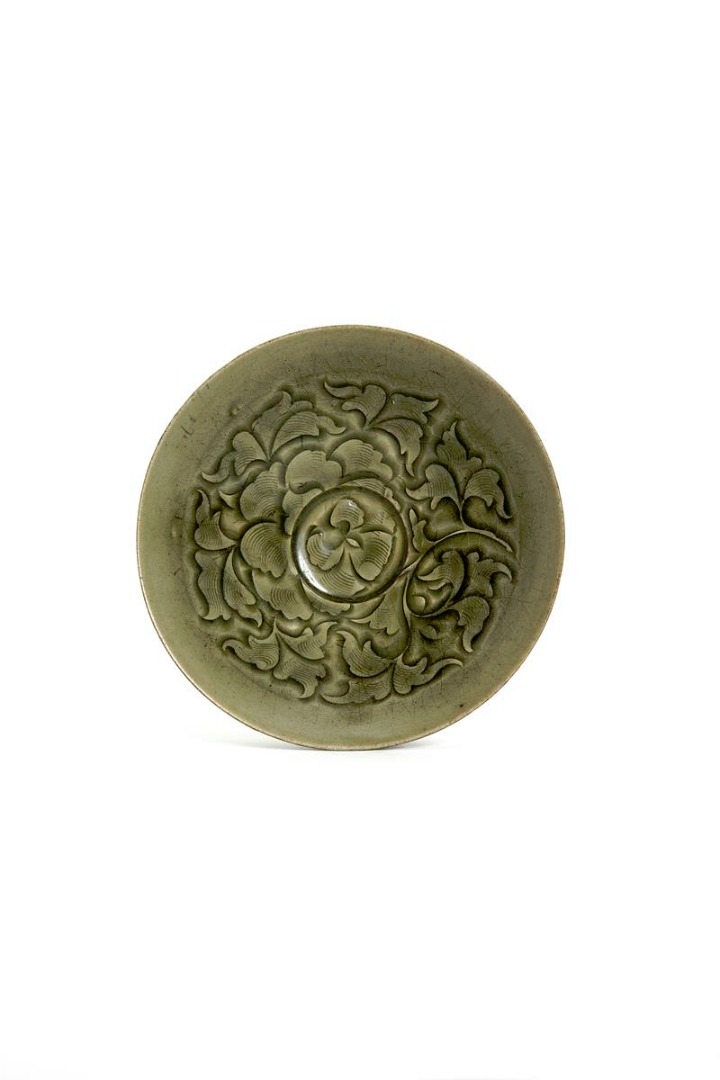 Delicately carved to the interior with peony, the exterior with incised bands radiating from a short ring foot, a paper label for The British Antique Dealers' Association, 19.8cm.