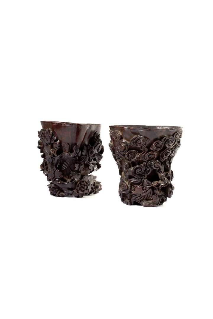 A RARE PAIR OF CHINESE CHENGXIANGMU DRAGON AND PHOENIX LIBATION CUPS LATE MING/EARLY QING DYNASTY...