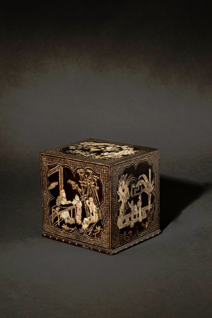 The outer box with a loose rectangular handle to each side and with two drawers within, the exterior inlaid with mother of pearl depicting shaped panels containing figures engaged in various activities in gardens, all contained within geometric borders, the drawers with chrysanthemum emerging from rockwork with a butterfly beneath a foliate spray, contained in a fitted wooden box, 16.2cm x 14cm x 16.2cm. (5)