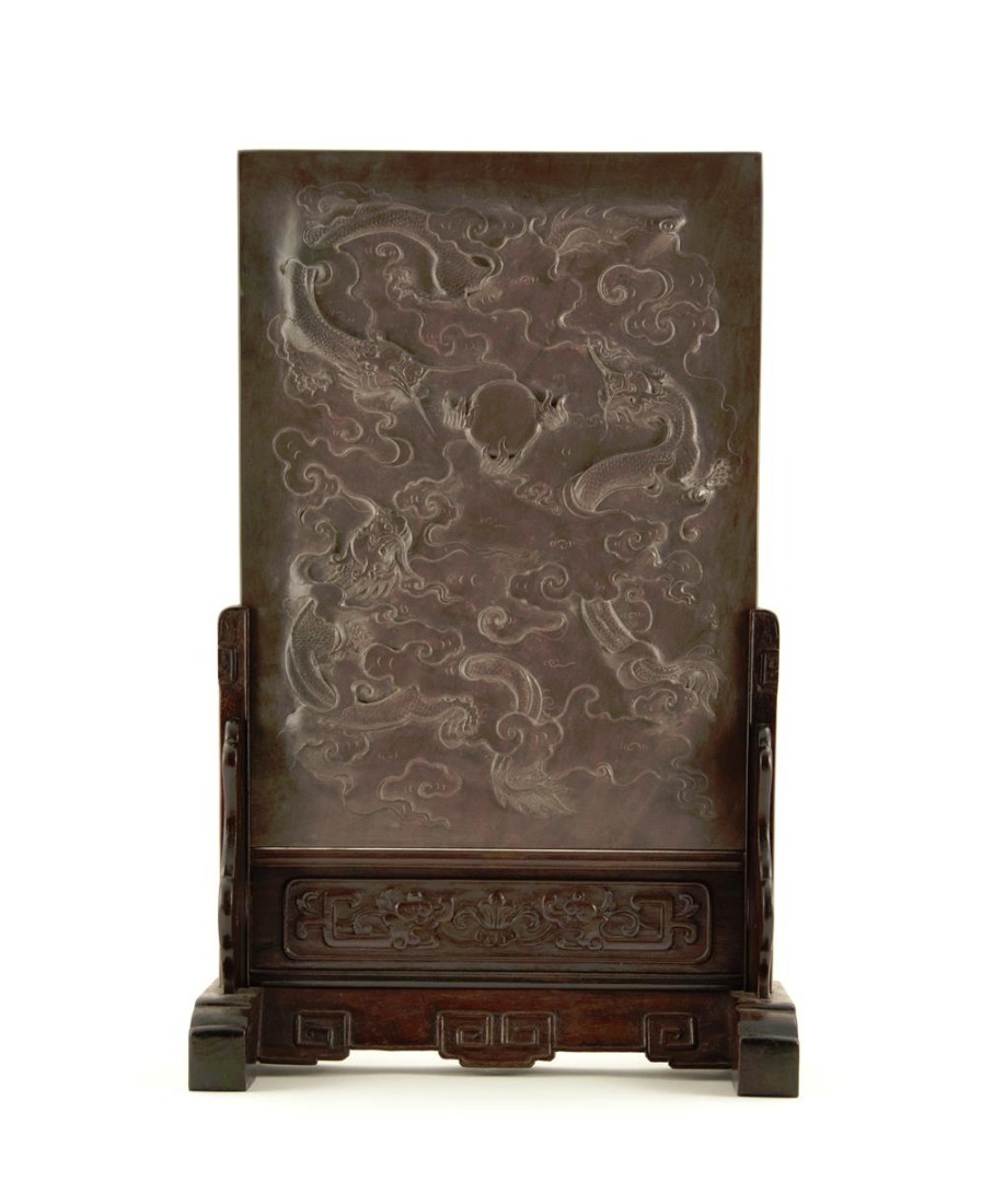 A CHINESE DUAN STONE TABLE SCREEN QING DYNASTY Carved to one side in relief with three writhing...