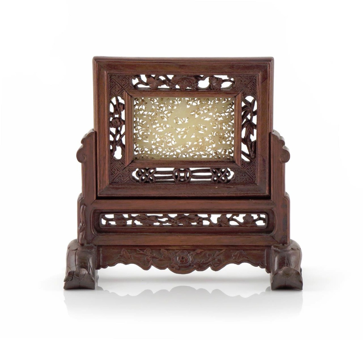 Mounted with an openwork pale celadon jade plaque carved with a dragon, two deer, a bat and a bird amongst scrolls, the hardwood frame carved with fruiting vines, bamboo and prunus on key fret grounds, the feet formed as large lotus leaves, 19cm x 20cm overall. (2)